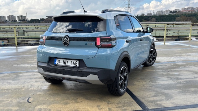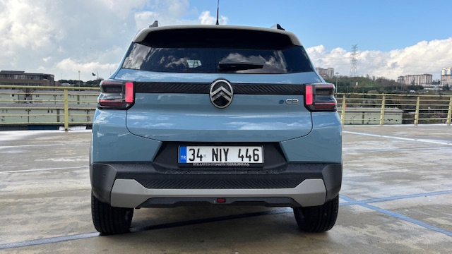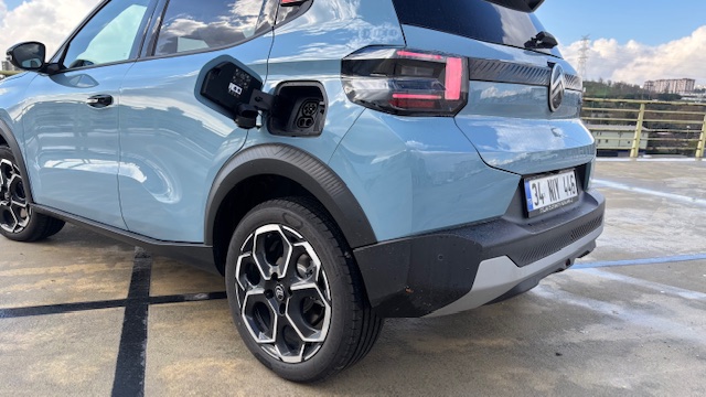 - SUV Görünümü: Alt koruma plastiği ve belirgin gümüş renkli koruma detayı (skid plate), e-C3’e bir kompakt şehirli karakteri veriyor. Bu yerden yüksek yapı, özellikle şehir içi kaldırım ve engellerle başa çıkmada pratik avantaj sağlıyor.