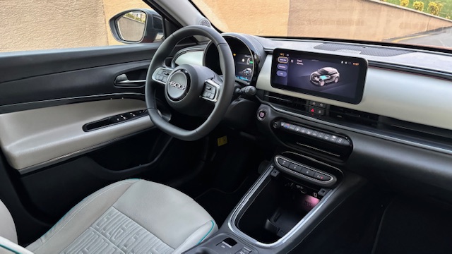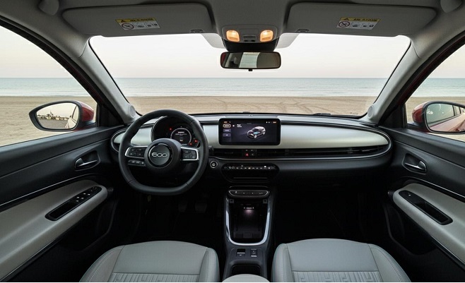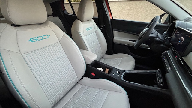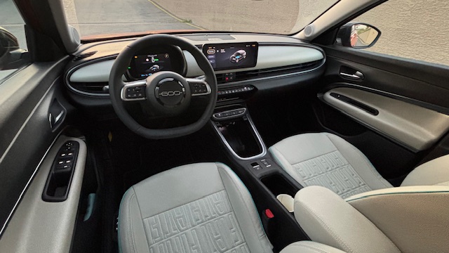 - İki Kollu Retro-Modern Direksiyon: 600e’nin direksiyonu, klasik Fiat 500 modellerine selam gönderen ama tamamen modern iki kollu bir yapıya sahip. Fildişi rengi deri kaplama, ellerini terletmeyen ve her tutuşta yüksek kalite hissi veren bir dokuya sahip. Direksiyon üzerindeki otonom sürüş kumandaları ve medya tuşları, “tık” sesiyle o kadar tok bir geri bildirim veriyor ki, mühendisliğin her noktada işlediğini anlıyorsun.