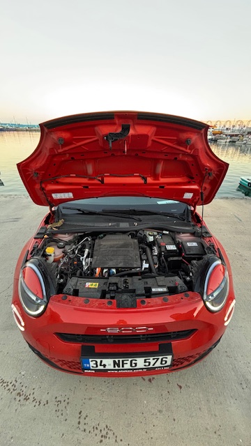 Fiat 600e’nin Sürüş Dinamikleri ve Yol Tutuşu: Elektrikli araçların en büyük handikabı, bataryalar nedeniyle ağırlaşan gövdeleridir. Ancak Fiat 600e, e-CMP2 platformunun sunduğu ağırlık dengesiyle fizik kurallarına meydan okuyor. Virajlardaki İtalyan disiplini sayesinde 600e ile sert bir viraja girdiğinizde sizi şaşırtacak ilk şey, aracın “düşük ağırlık merkezi” olacak. 54 kWh’lık batarya paketi, şasinin tam altına, iki aksın arasına bir mühür gibi yerleştirilmiş. Bu sayede araç, virajlarda bir SUV’dan beklemeyeceğiniz kadar az gövde salınımı (body roll) yapıyor. Direksiyonu kırdığınız anda ön taraf, sanki bir mıknatıs tarafından çekiliyormuşçasına rotasına sadık kalıyor.