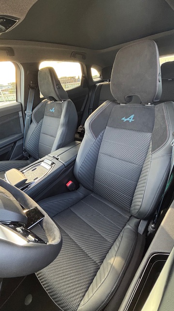 - Esprit Alpine Kalitesi ve Dokunuşlar: İç mekandaki malzeme kalitesi, aracın premium iddiasını destekliyor. Mavi/beyaz/kırmızı dikiş detaylarına sahip Alcantara ve Nappa deri kombinasyonlu spor koltuklar, hem sportif hem de uzun yolculuklara uygun konforu sağlıyor. Alpine işlemeli spor direksiyon simidi, ele mükemmel oturarak sürüş kontrolünü artırıyor. Yumuşak dokunuşlu yüzeyler, alüminyum pedal seti ve kabin içi ambiyans aydınlatması, iç mekanın sofistike atmosferini tamamlıyor.